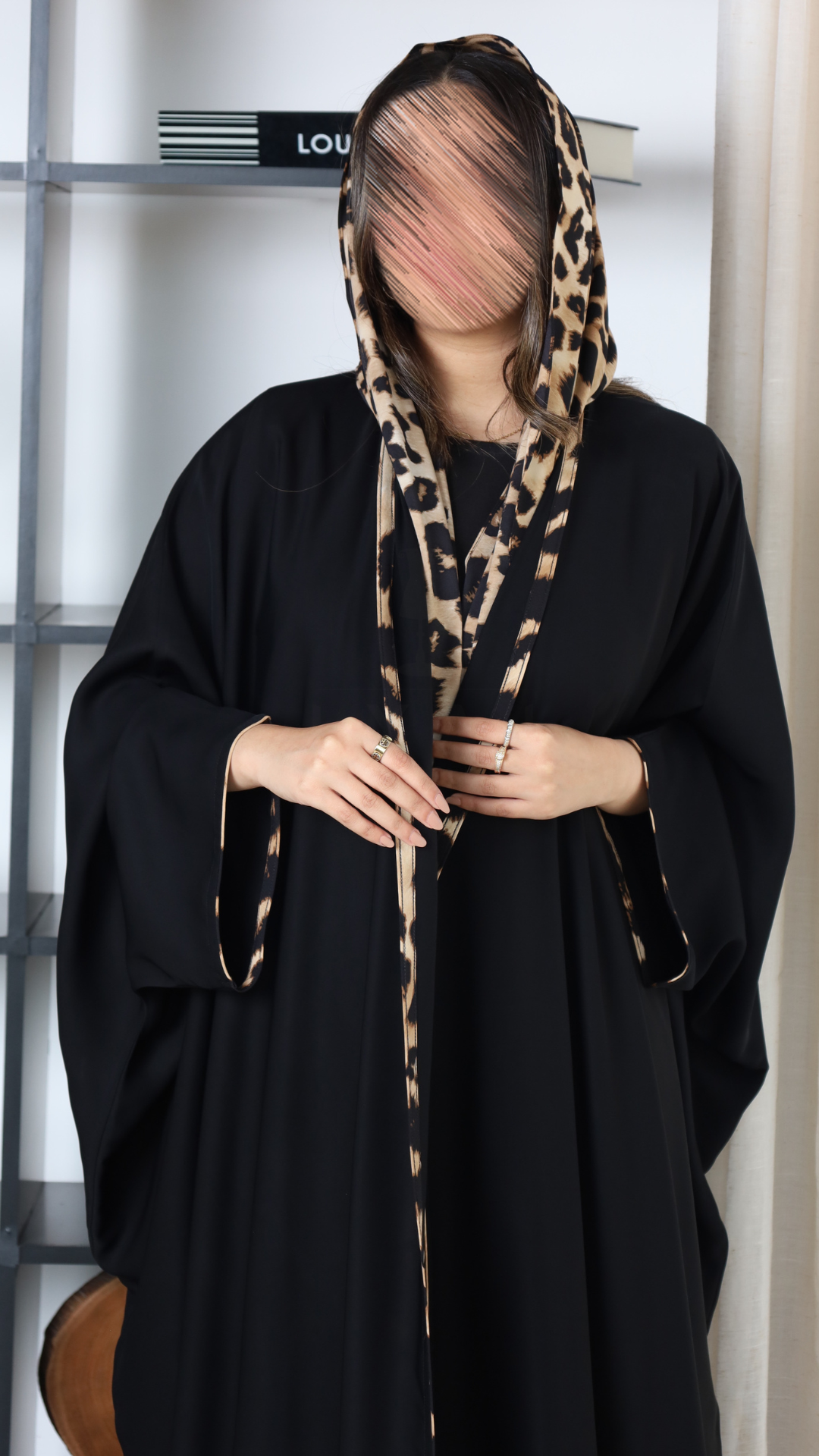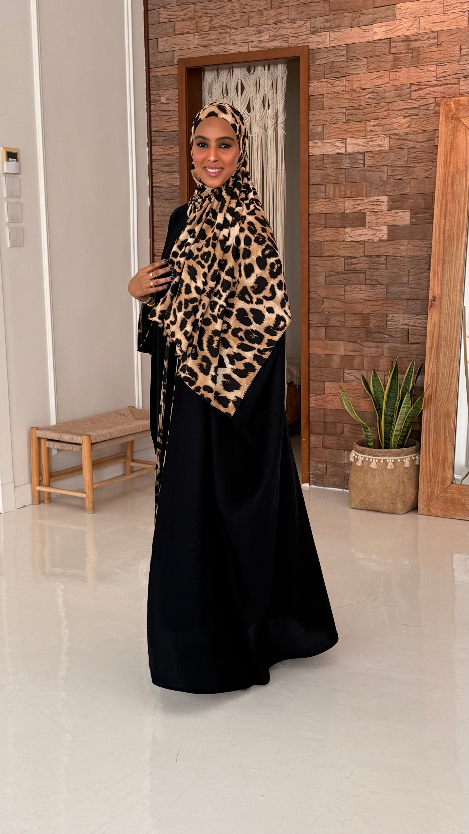 Abaya with leopard print on the sleeves and front, and a full leopard print Hijab