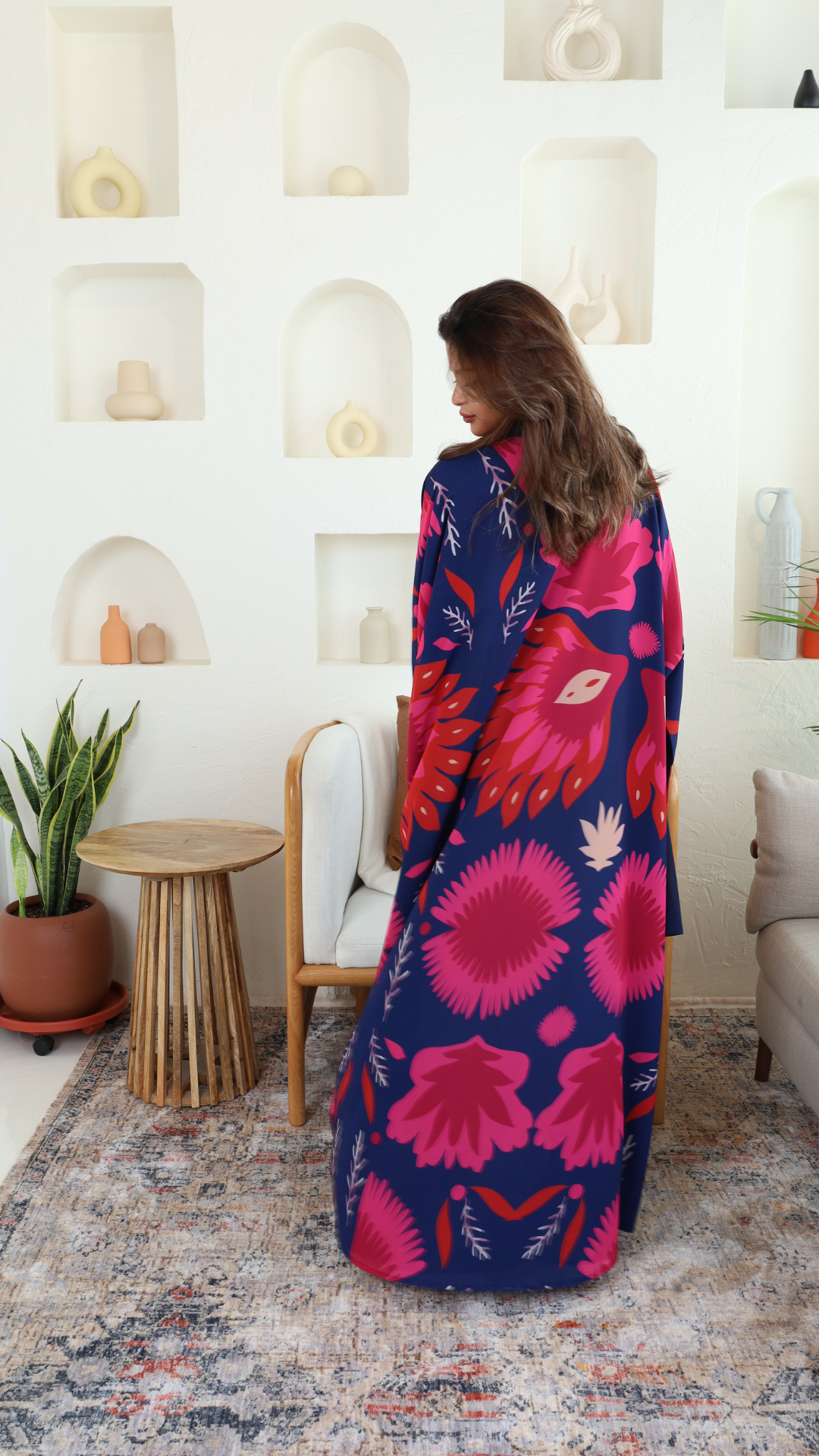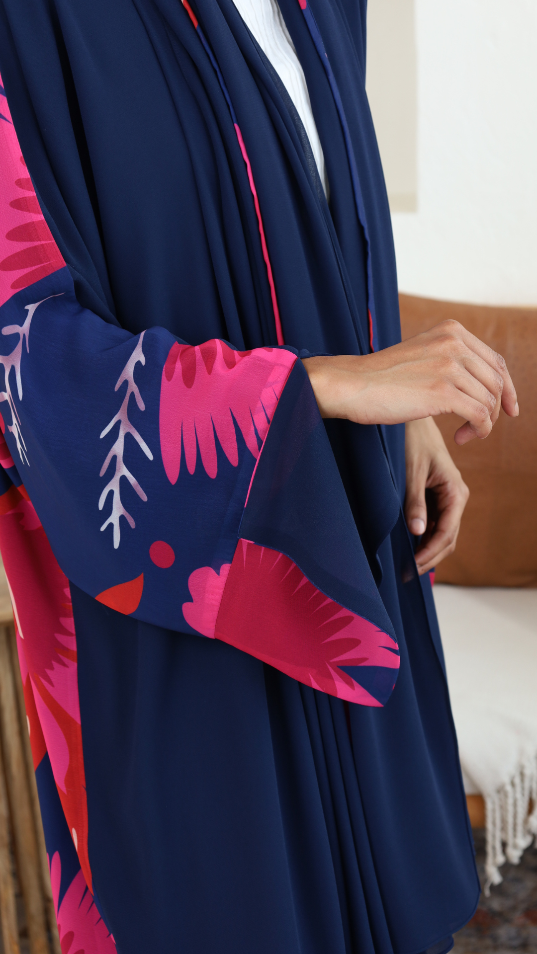 Bold floral print in pink and red tones on the back, with a plain navy front