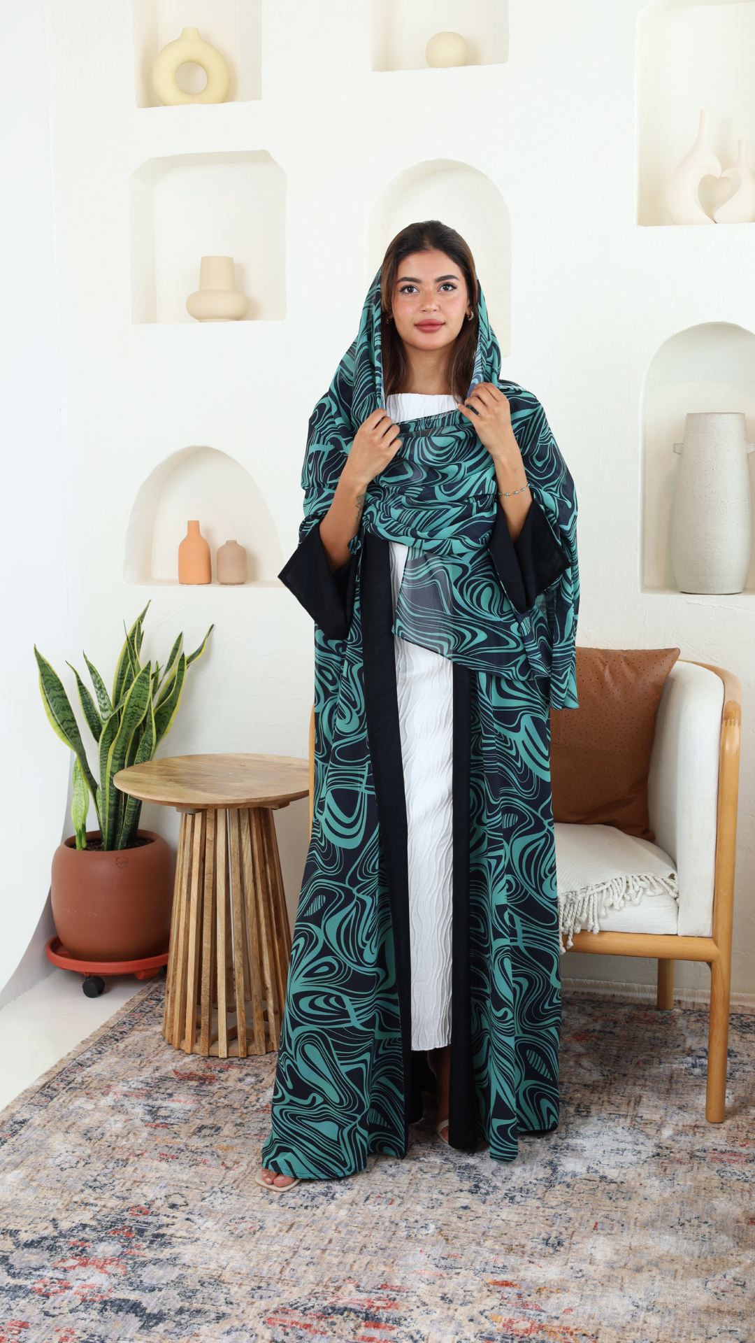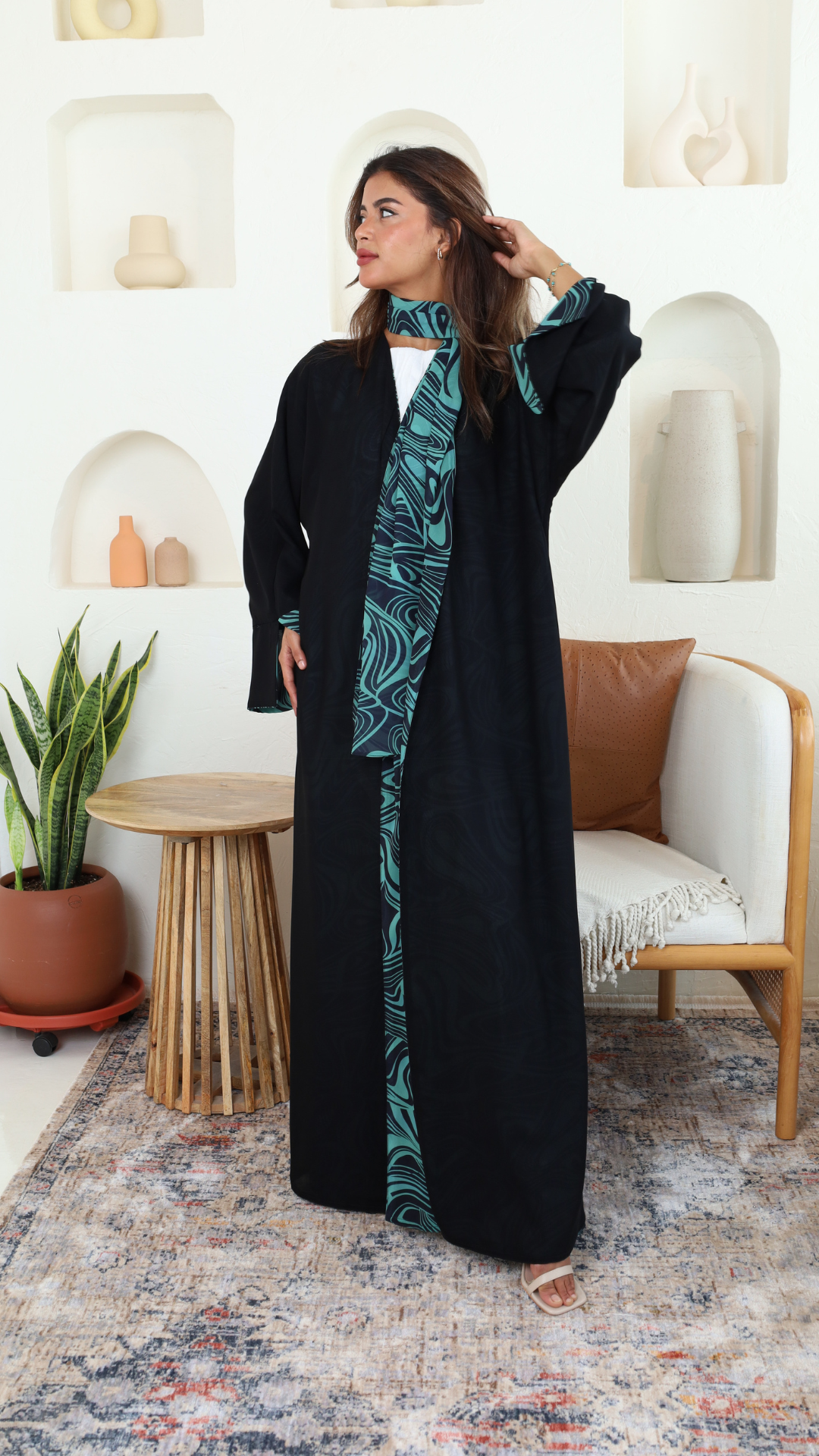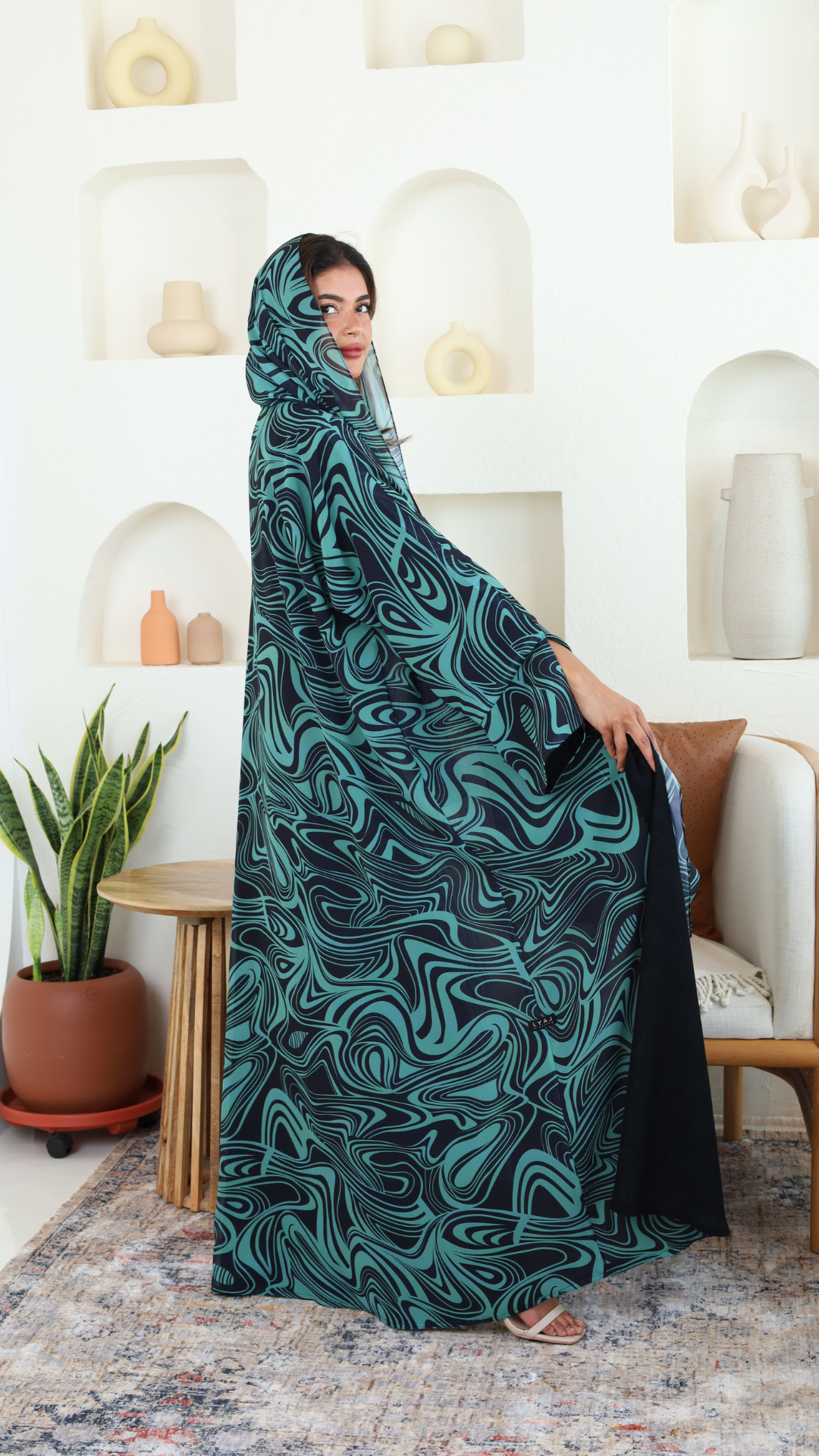 A very cool and breezy summer abaya with a unique printed design and double-sided style.