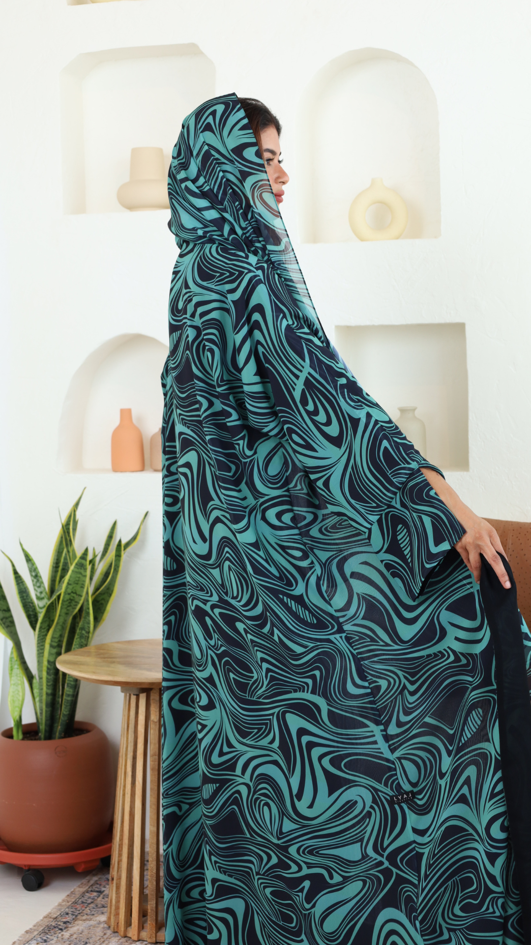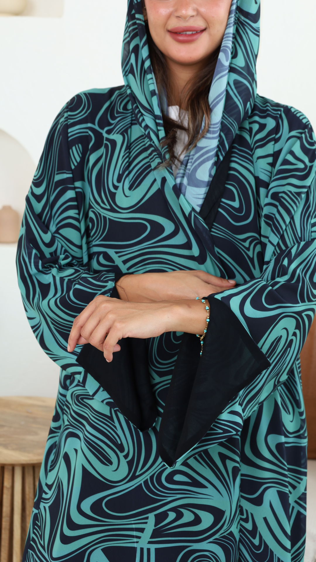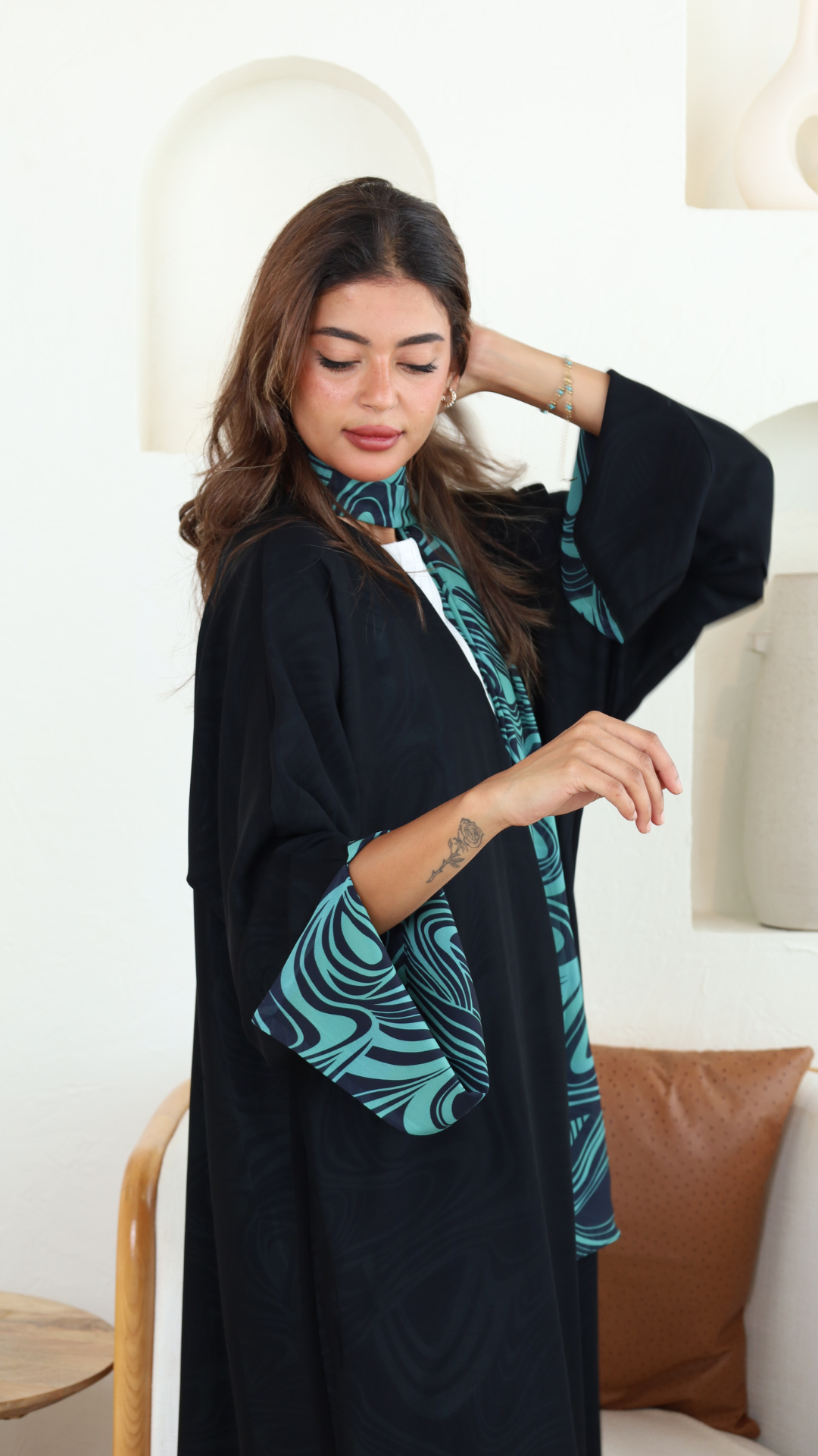 A very cool and breezy summer abaya with a unique printed design and double-sided style.