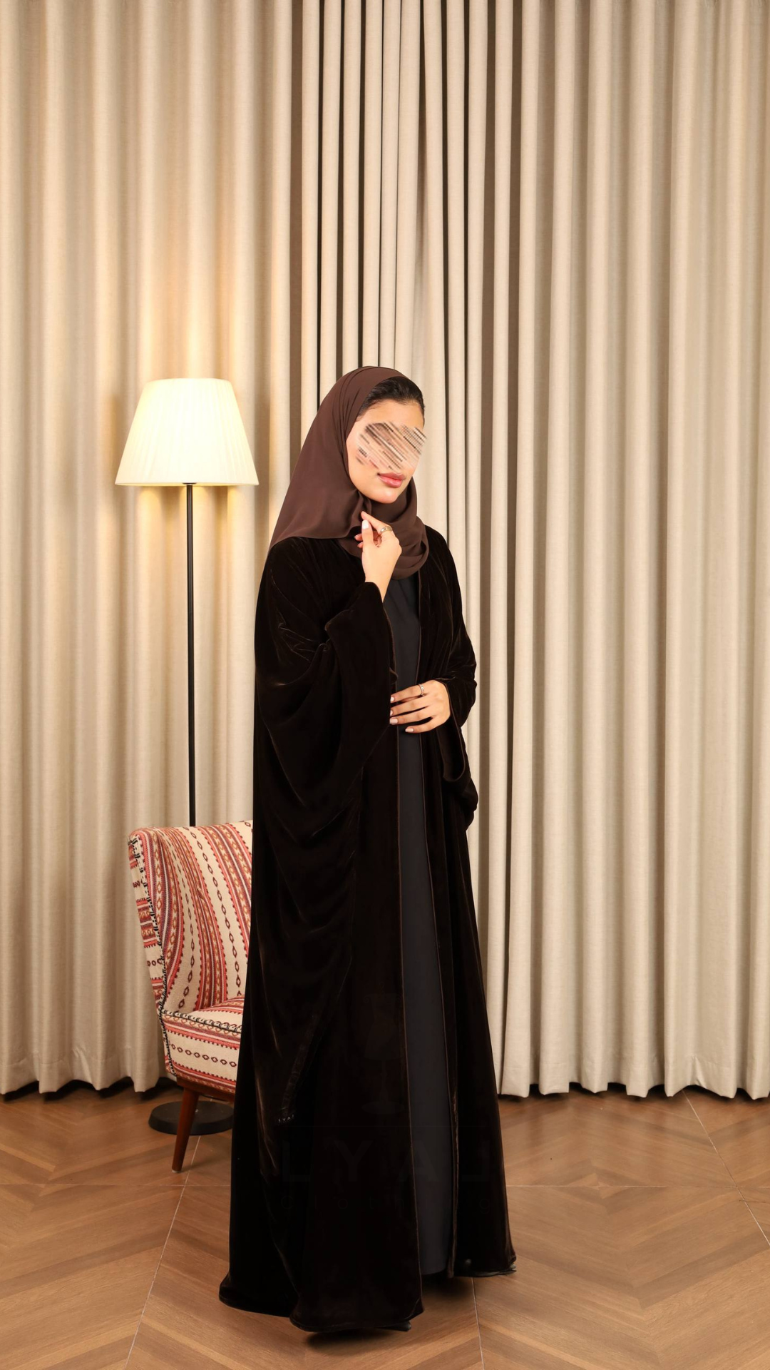 Velvet Winter Abaya with a half-bisht design, wide sleeves, and braid details for a chic, warm look
